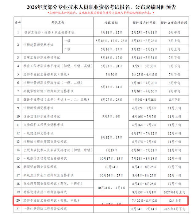 根据中国人事考试网发布的《2026年度专业技术人员职业资格考试重要事项提示》消息,2026年经济师报名时间确定!